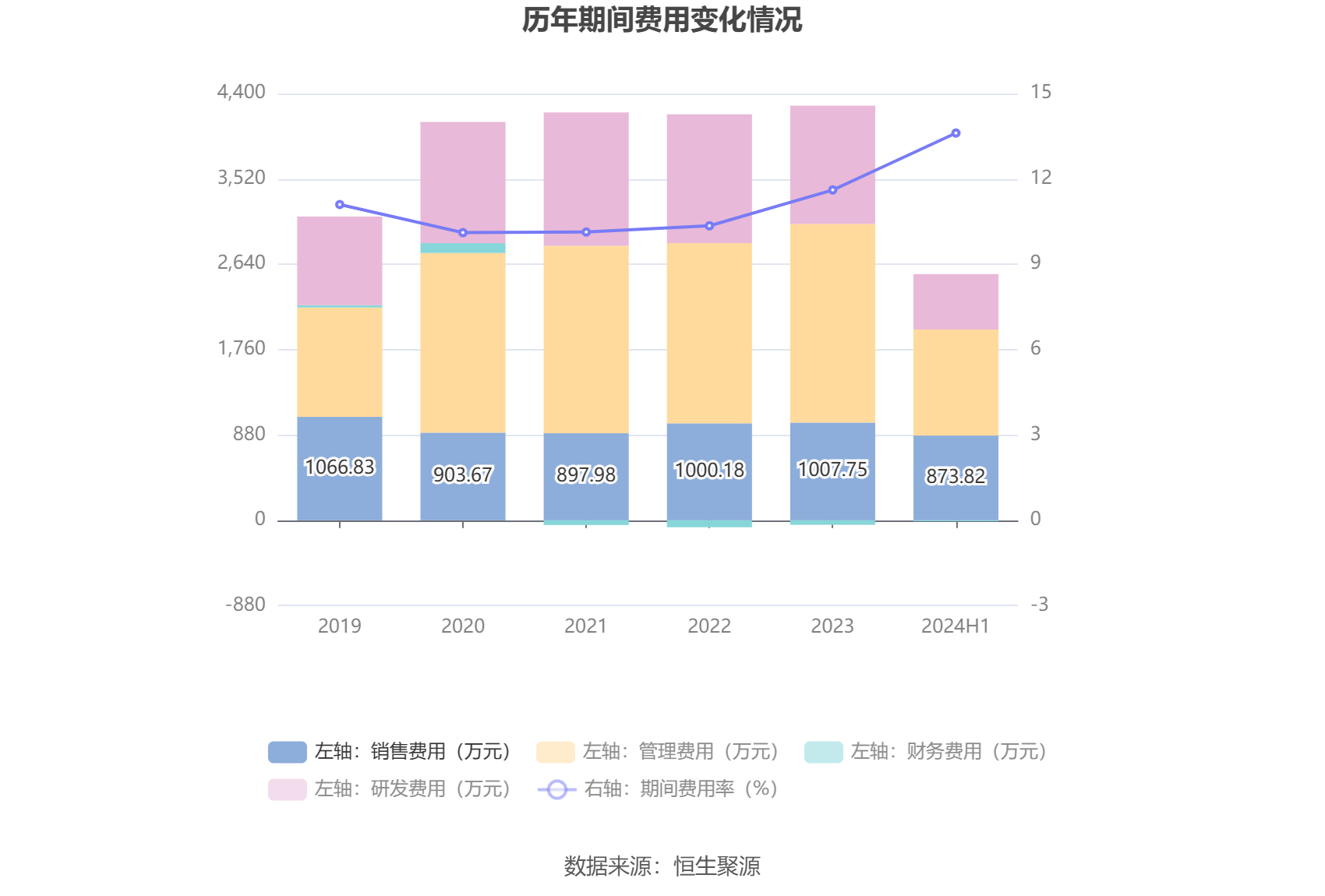 2024年上半年,公司期间费用为2529.54万元,较上年同期减少45.66万元;但期间费用率为13.61%,较上年同期上升1.50个百分点。其中,销售费用同比下降6.07%,管理费用同比增长2.67%,研发费用同比下降6.7%,财务费用由去年同期的-32.49万元变为-9.10万元。