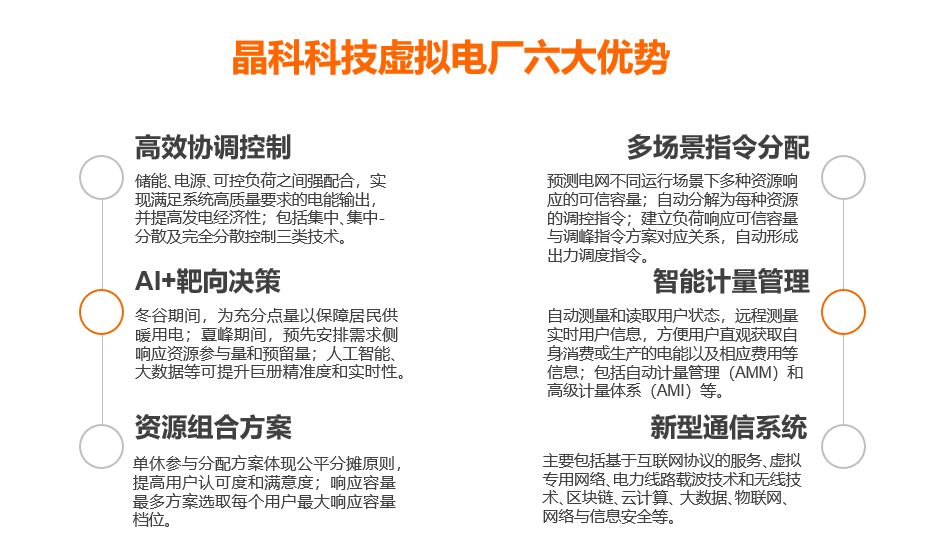 随着中央到地方相关政策的持续驱动,可调节负荷、用户侧储能等需求侧资源规模的不断提升,可控负荷、?新型储能、?分布式新能源等灵活性资源提供了进入市场的机会,虚拟电厂市场将快速发展。在此背景下,晶科科技积极布局开展虚拟电厂业务,致力于成为虚拟电厂聚合商。公司旗下综合能源服务商晶科慧能于2022年率先在浙江参与虚拟电厂运营,并以负荷聚合商身份助力浙江完成全国首个接入调度系统、参与系统实时响应调节的虚拟电厂项目。