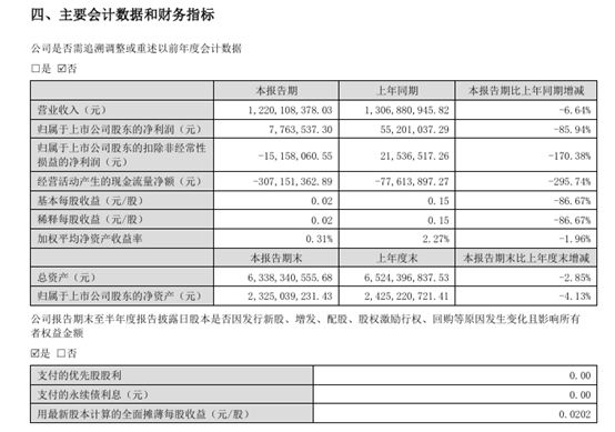 8月24日,凯伦股份(维权)发布半年报,公司今年上半年实现营收12.20亿元,同比下降6.64%,归母净利润776.35万,同比下降85.94%。
