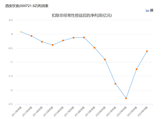 餐饮是旅游行业中特色赛道。西安饮食集西安餐饮老字号和特色食品加工两大特色资源禀赋,但2024年上半年,公司实现营业收入3.49亿元,同比下降7.93%;归母净利润亏损5964.63万元。而且从2013年开始,西安饮食的扣除非经常性损益均为亏损,至今已连续11年。