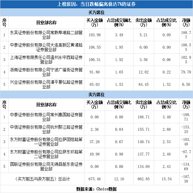 买一席位是东吴证券常熟阜湖路二部营业部,该席位买入金额为193.98万元,占该股总成交额的3.49%。该营业部三个月内上榜7次,实力排名第795。