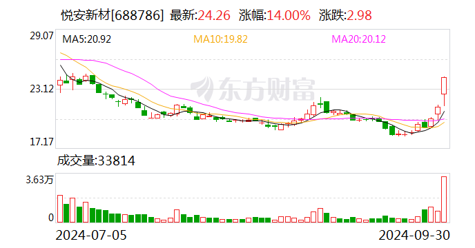 2024年9月30日,悦安新材发生了2笔大宗交易,总成交36.8万股,成交金额626.71万元,成交均价17.03元。当日收盘报价24.26元,涨幅14.00%,成交金额7728.6万元;大宗交易成交金额占当日成交金额8.11%,折价29.80%。