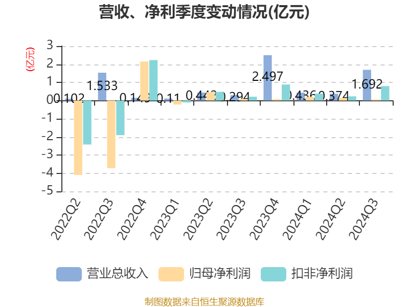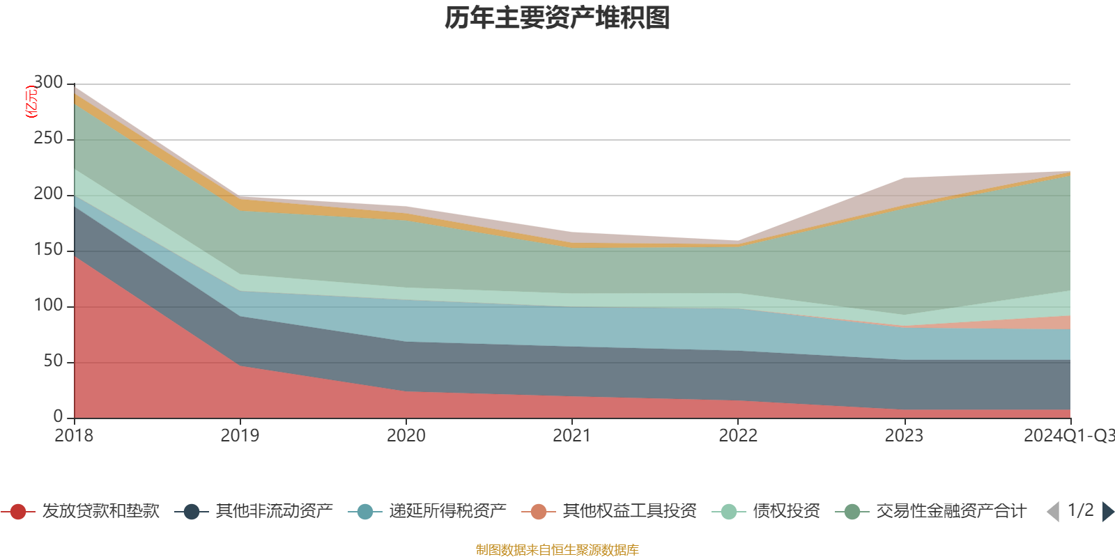 资产重大变化方面,截至2024年三季度末,公司货币资金较上年末减少96.11%,占公司总资产比重下降10.56个百分点;债权投资较上年末增加126.56%,占公司总资产比重上升5.45个百分点;其他权益工具投资较上年末增加645.33%,占公司总资产比重上升4.71个百分点;交易性金融资产合计较上年末增加7.92%,占公司总资产比重上升2.66个百分点。