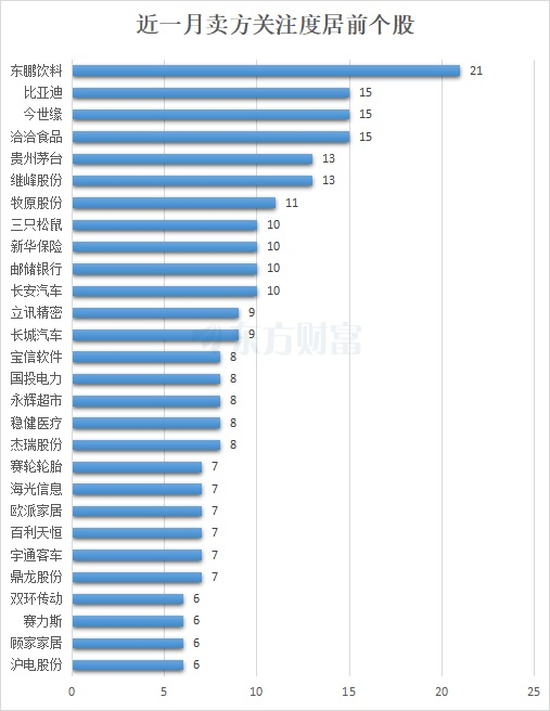 具体看个股,东鹏饮料为近一月卖方关注度居前个股,被21篇券商研报覆盖。比亚迪、今世缘、洽洽食品并列其后,均被15篇研报覆盖。贵州茅台、继峰股份并列第三,均被13篇研报覆盖。