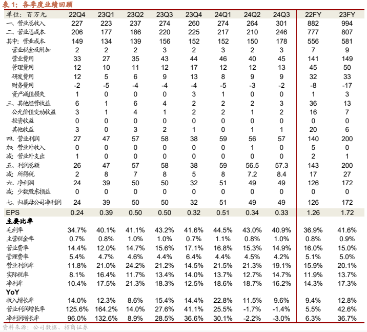 Q4及明年展望:葱油酱高增持续性可期,期待香菇酱改善+新品发力。收入端看,24年前三季度公司增长主要受大单品葱油酱高增长驱动,背后逻辑在于产品满足细分消费需求以及重点布局线上渠道,取得成功。调味食品中香菇酱整体增长平稳,上半年增长相对较缓,Q3公司加大终端推广力度后,实现双位数增长,调味配料则保持稳步增长。Q4看,随着双十一到来,葱油酱当前已形成品牌势能,结合线上渠道快速扩张,仍处于放量阶段,并形成较强品牌势能,有望继续带动整体收入提升。预计全年收入端实现双位数以上增长。盈利端看,下半年毛利率压力相对较大,预计全年利润增速慢于收入。展望明年,葱油酱规模相比香菇酱仍有差距,尚未到天花板,预计明年仍会保持较快增长速度,也是公司的主要驱动力之一。此外,随着公司线下渠道的布局,以及蒜蓉酱、成都红油酱等新品的不断拓展,期待大单品香菇酱重回增长态势,同时关注其他新品爆发潜力。