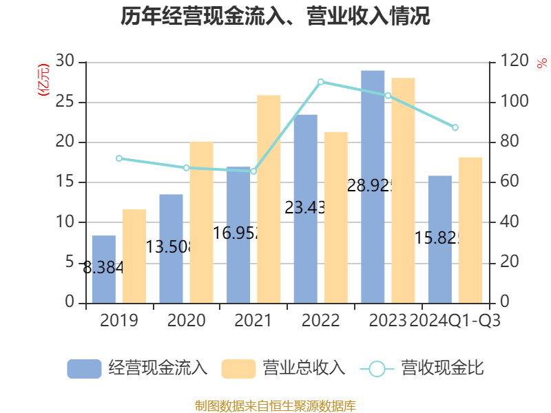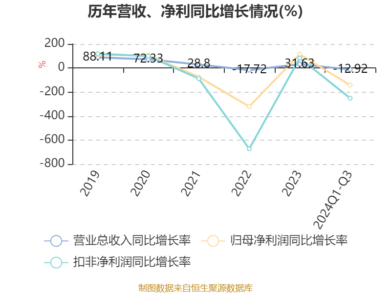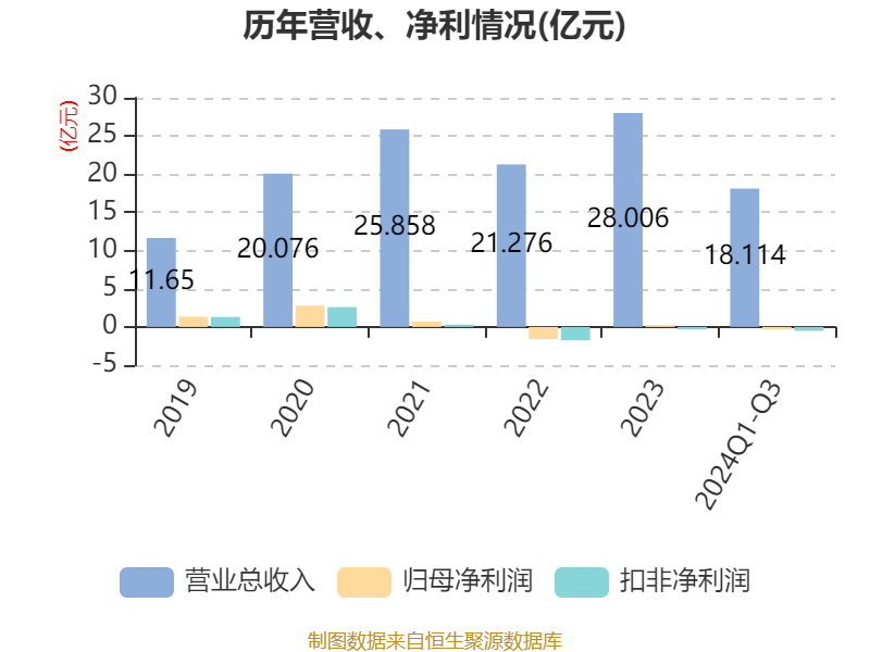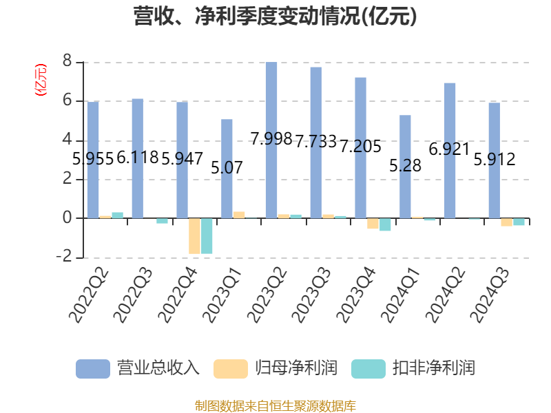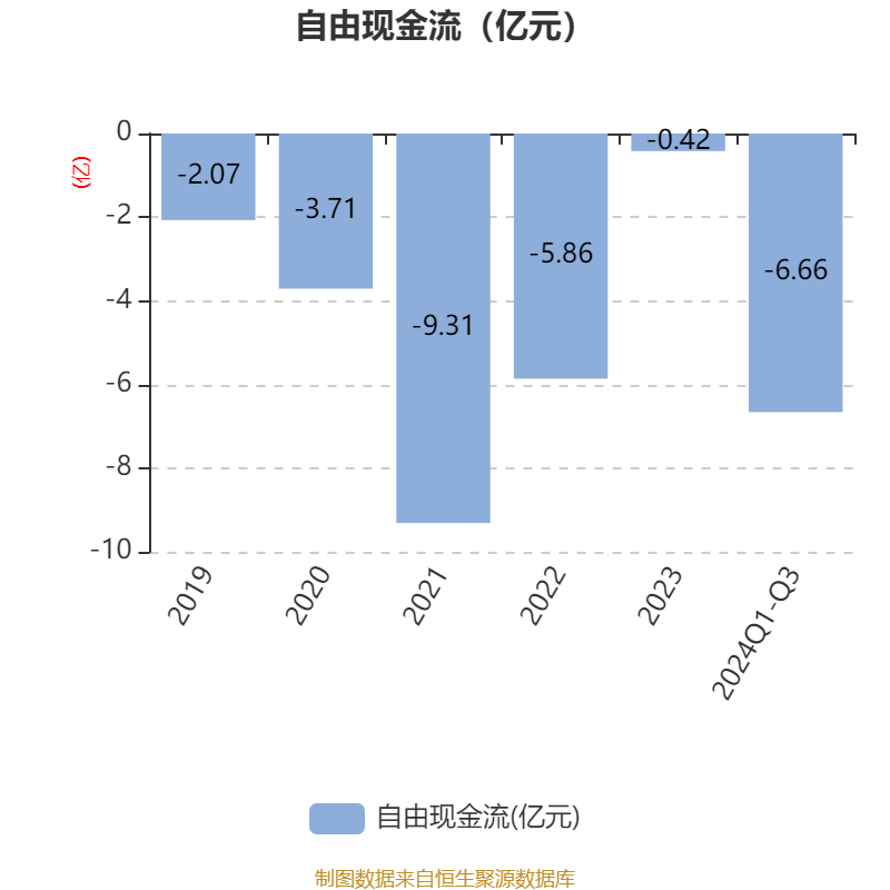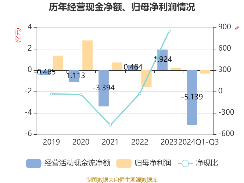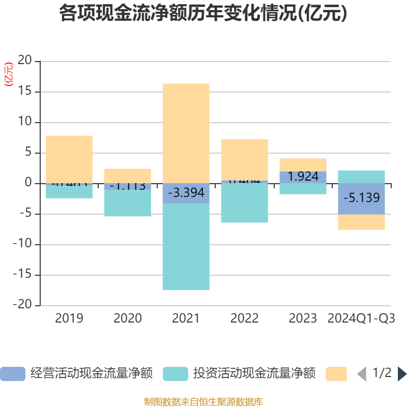 2024年前三季度,公司经营活动现金流净额为-5.14亿元,同比减少2.4亿元;筹资活动现金流净额-2.5亿元,同比减少6.89亿元;投资活动现金流净额2.07亿元,上年同期为-1.16亿元。