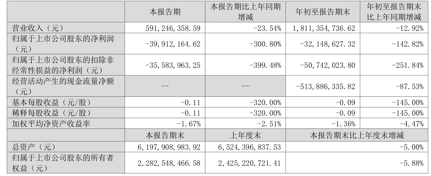 中证智能财讯凯伦股份(维权)(300715)10月24日披露2024年第三季度报告。前三季度公司实现营业收入18.11亿元,同比下降12.92%;归母净利润亏损3214.86万元,上年同期盈利7507.76万元;扣非净利润亏损5074.2万元,上年同期盈利3341.85万元;经营活动产生的现金流量净额为-5.14亿元,上年同期为-2.74亿元;报告期内,凯伦股份基本每股收益为-0.09元,加权平均净资产收益率为-1.36%。