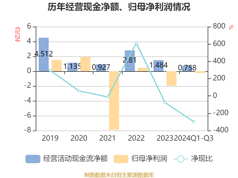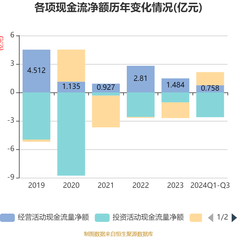 2024年前三季度,公司经营活动现金流净额为7581.42万元,同比增加9844.73万元;筹资活动现金流净额1.38亿元,同比增加3.74亿元;投资活动现金流净额-2.61亿元,上年同期为-9675.73万元。