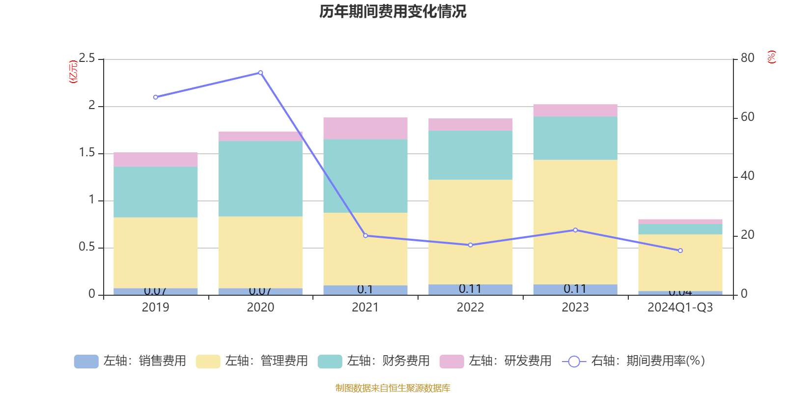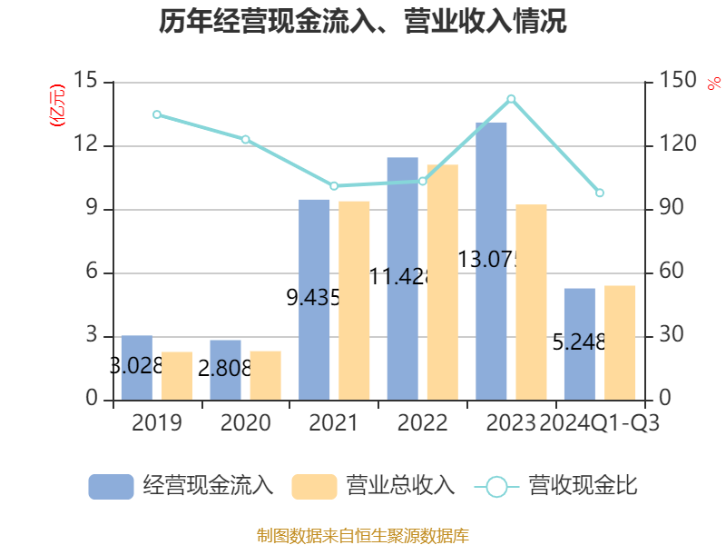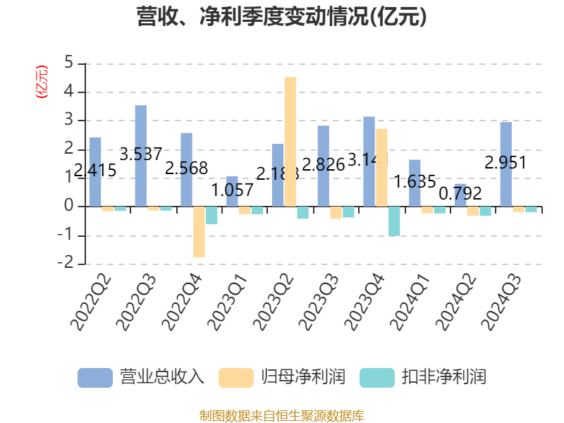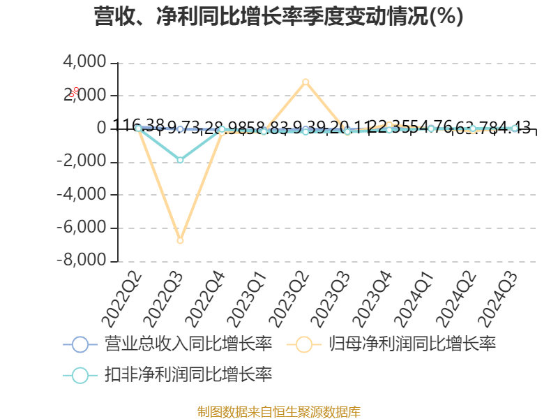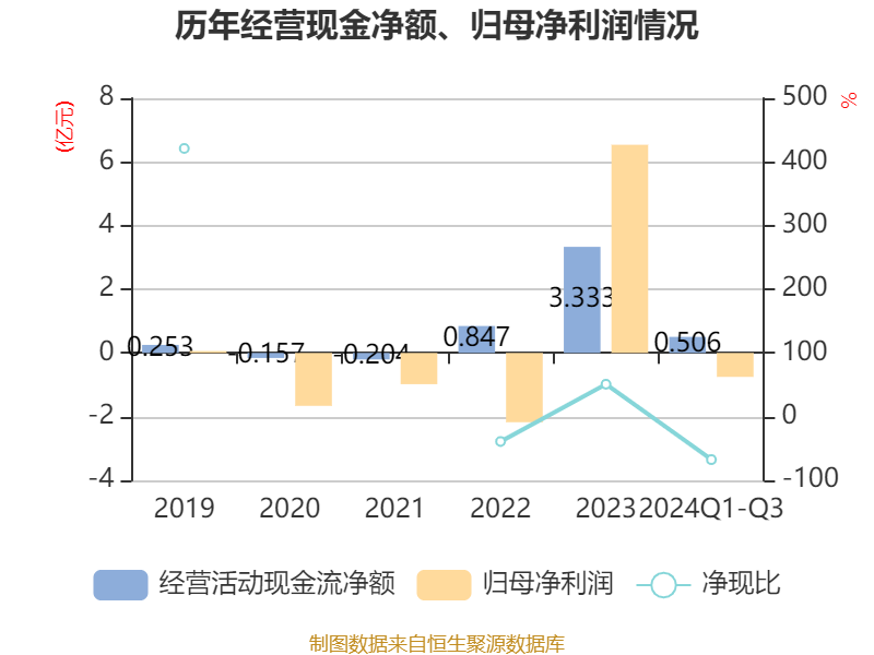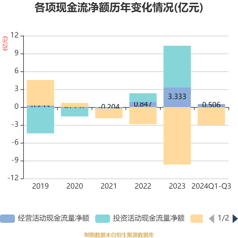 2024年前三季度,公司经营活动现金流净额为5063.67万元,同比下降71.67%;筹资活动现金流净额-3亿元,同比增加1.49亿元;投资活动现金流净额-102.17万元,上年同期为1.22亿元。