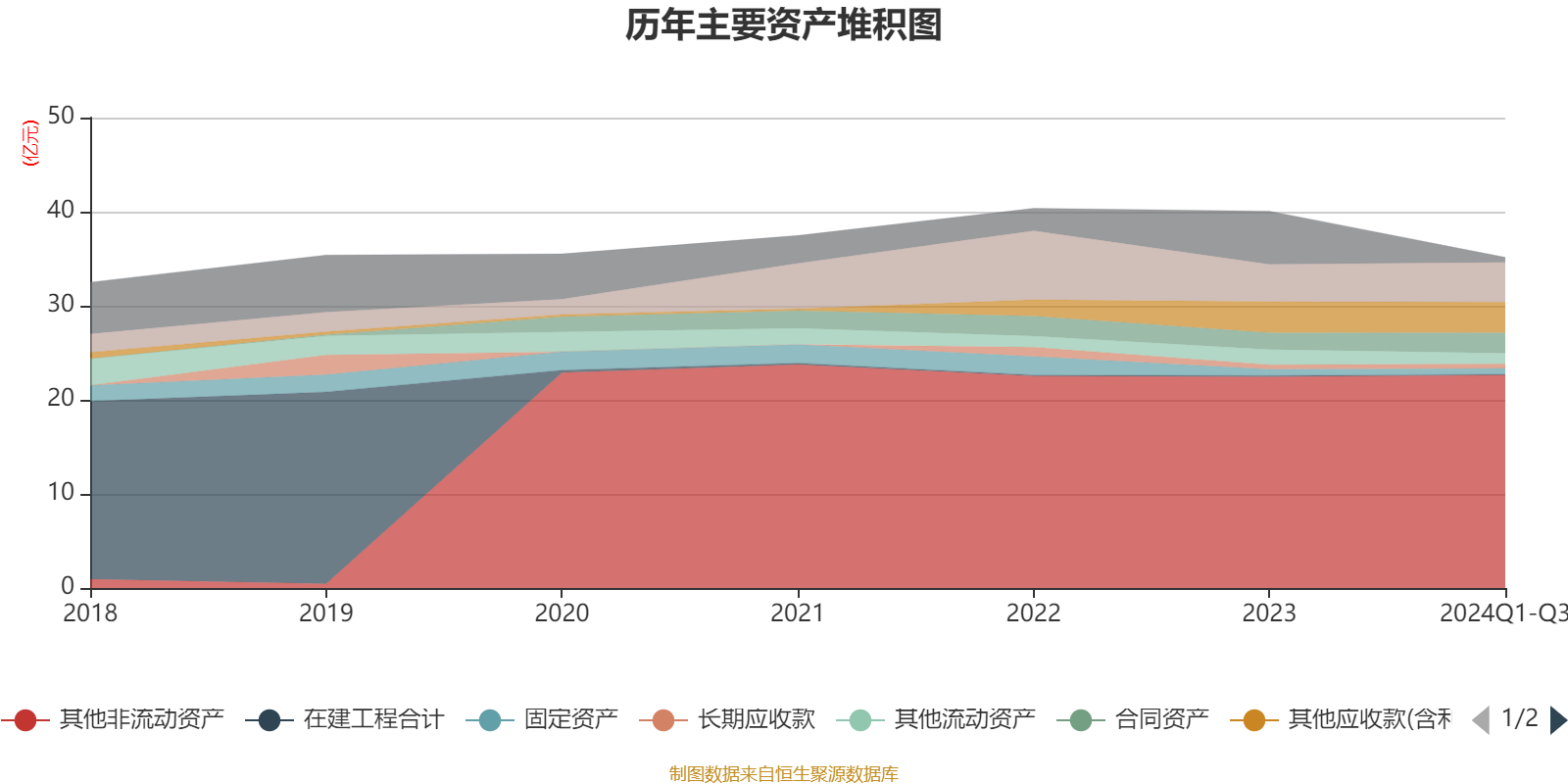 资产重大变化方面,截至2024年三季度末,公司货币资金较上年末减少90.55%,占公司总资产比重下降11.96个百分点;其他非流动资产较上年末增加0.83%,占公司总资产比重上升6.34个百分点;应收票据及应收账款较上年末增加6.97%,占公司总资产比重上升1.75个百分点;合同资产较上年末增加22.85%,占公司总资产比重上升1.54个百分点。