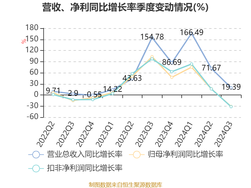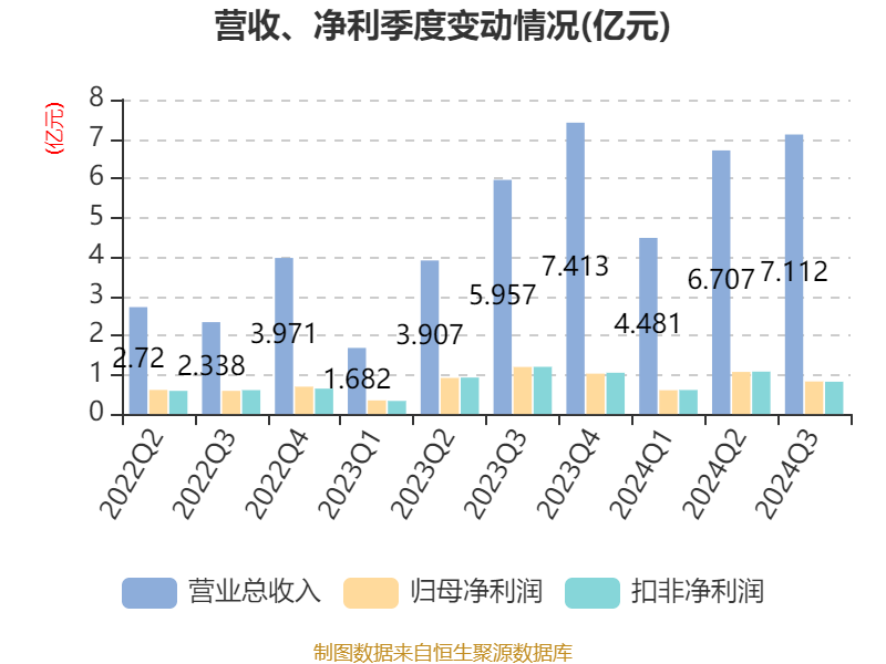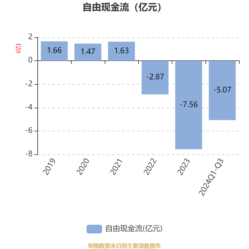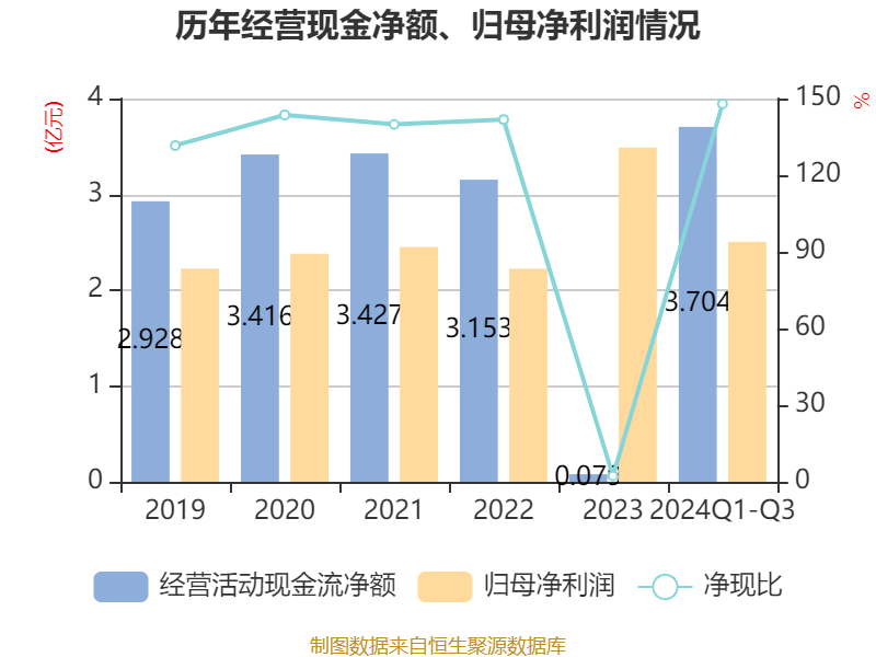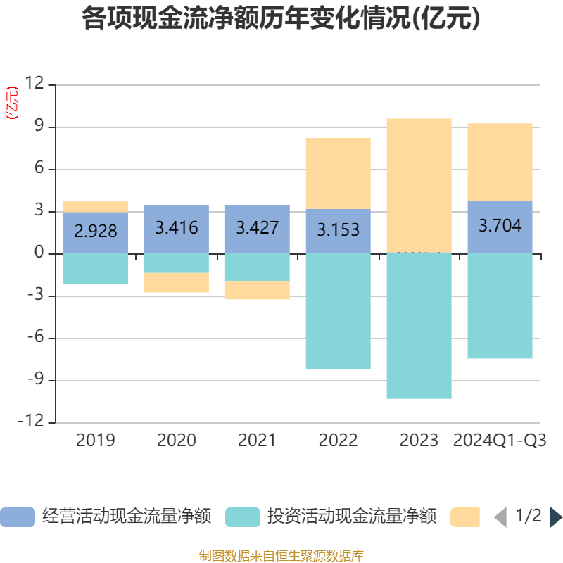 2024年前三季度,公司经营活动现金流净额为3.7亿元,同比增长81.75%;筹资活动现金流净额5.53亿元,同比减少3.95亿元;投资活动现金流净额-7.47亿元,上年同期为-10.85亿元。