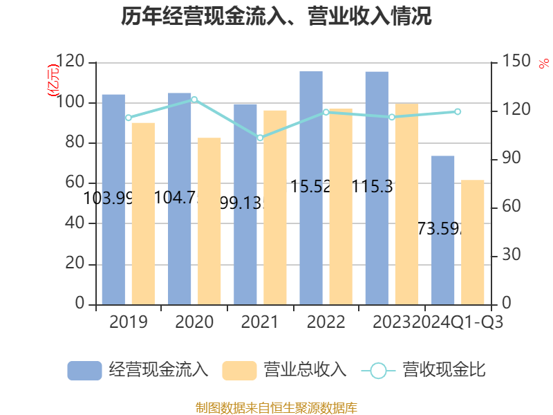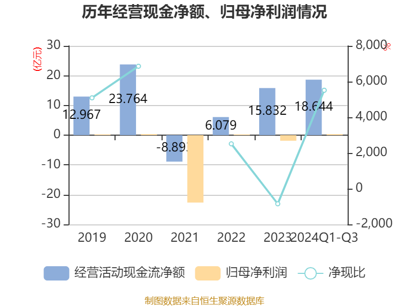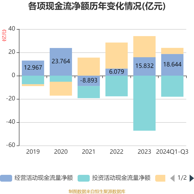 2024年前三季度,公司经营活动现金流净额为18.64亿元,同比增长66.15%;筹资活动现金流净额5.24亿元,同比增加1.81亿元;投资活动现金流净额-18.09亿元,上年同期为-27.97亿元。