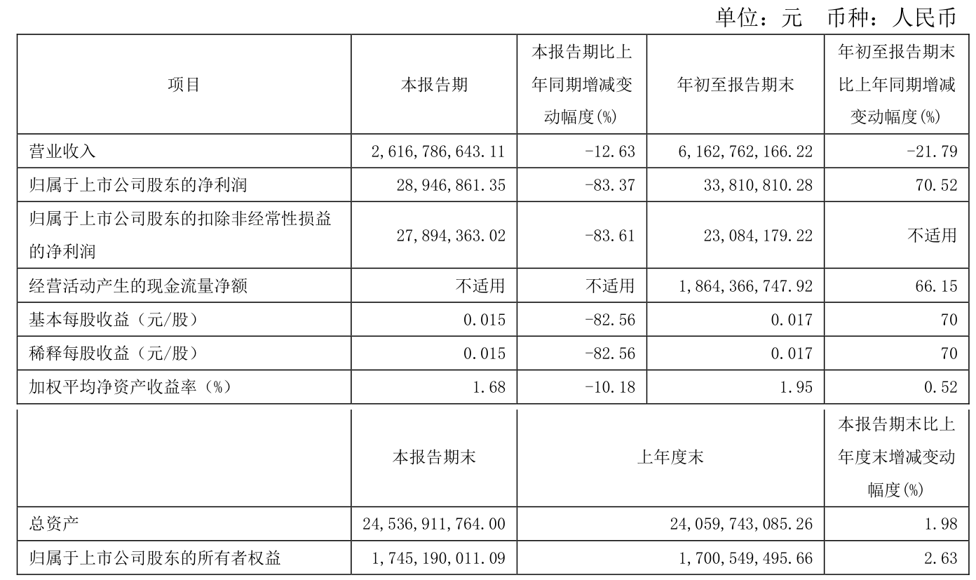 华银电力(600744)10月30日披露2024年第三季度报告。前三季度公司实现营业收入61.63亿元,同比下降21.79%;归母净利润3381.08万元,同比增长70.52%;扣非净利润2308.42万元,同比扭亏;经营活动产生的现金流量净额为18.64亿元,同比增长66.15%;报告期内,华银电力基本每股收益为0.017元,加权平均净资产收益率为1.95%。