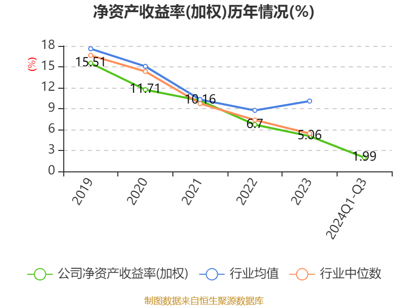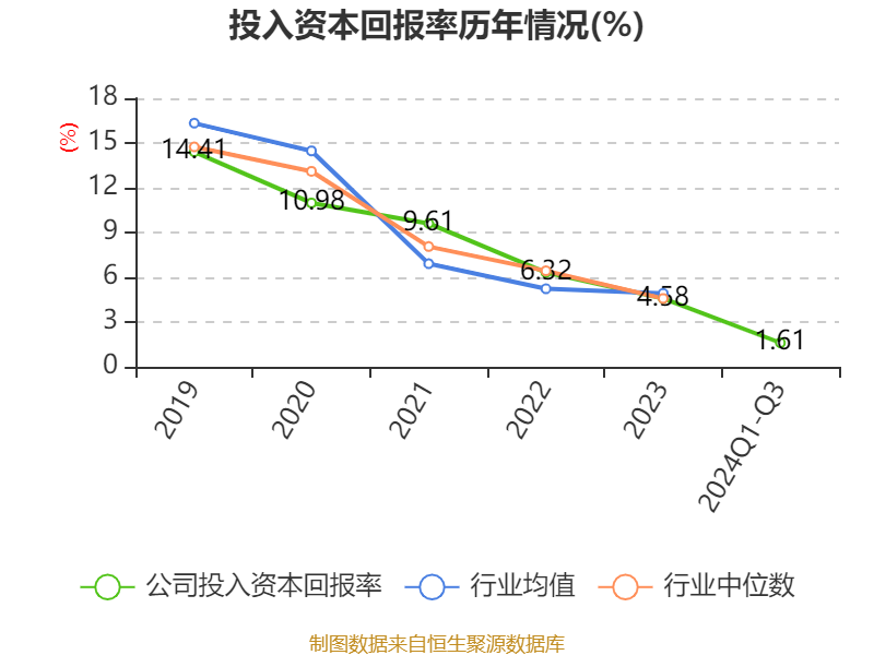 盈利能力方面, 2024年前三季度公司加权平均净资产收益率为1.99%,同比下降1.74个百分点。公司2024年前三季度投入资本回报率为1.61%,较上年同期下降1.72个百分点。
