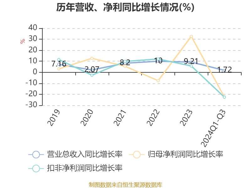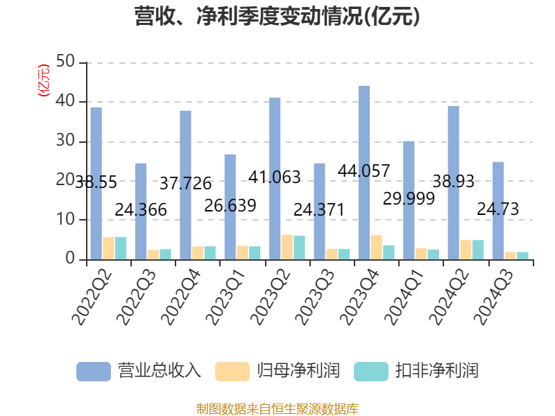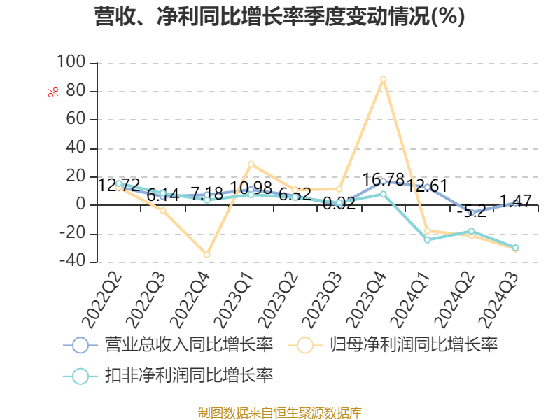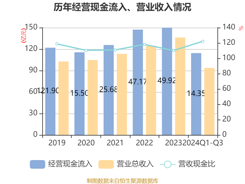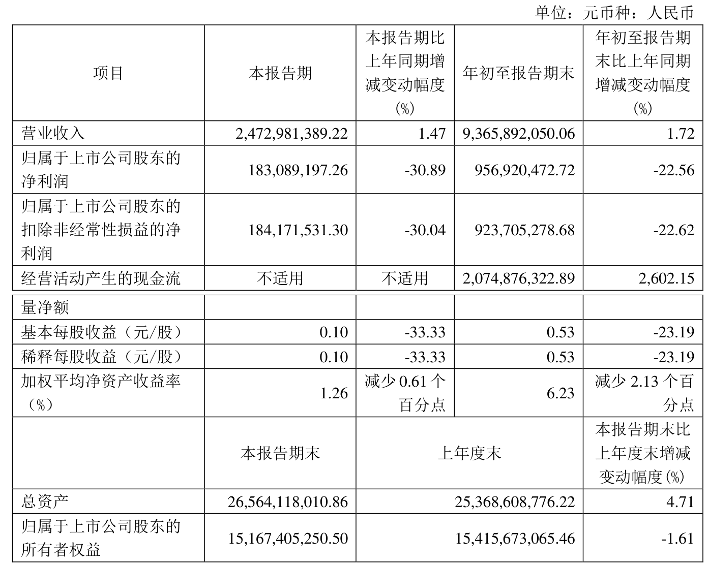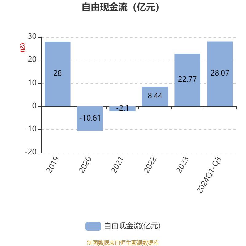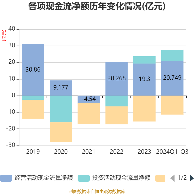 2024年前三季度,公司经营活动现金流净额为20.75亿元,同比增长2602.15%;筹资活动现金流净额-11.42亿元,同比增加3.72亿元;投资活动现金流净额6.86亿元,上年同期为3.28亿元。