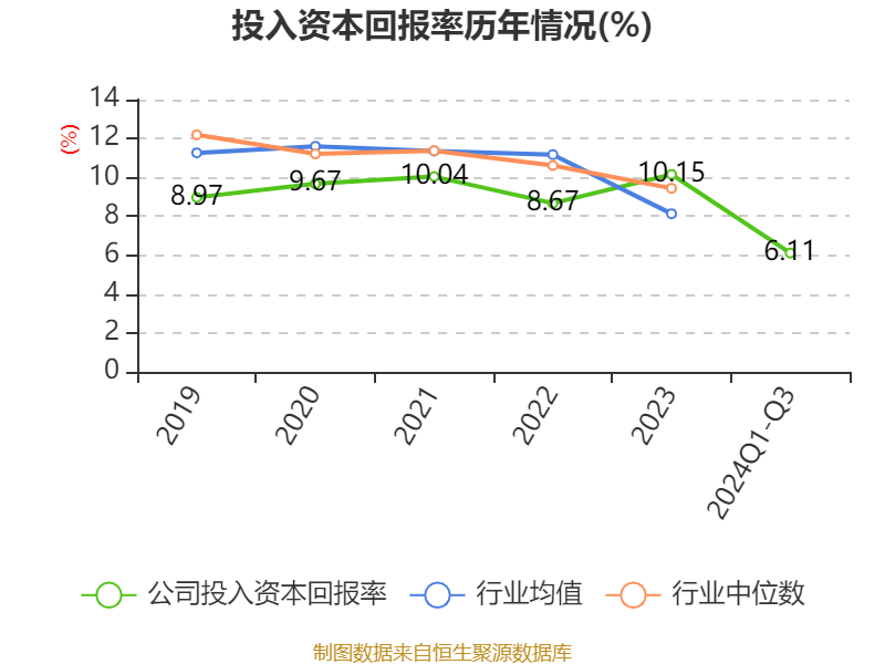 盈利能力方面, 2024年前三季度公司加权平均净资产收益率为6.23%,同比下降2.13个百分点。公司2024年前三季度投入资本回报率为6.11%,较上年同期下降1.54个百分点。