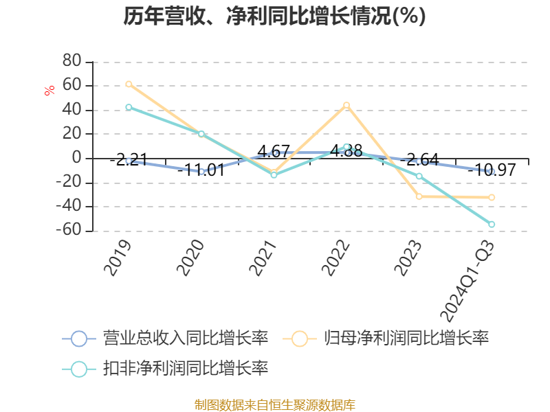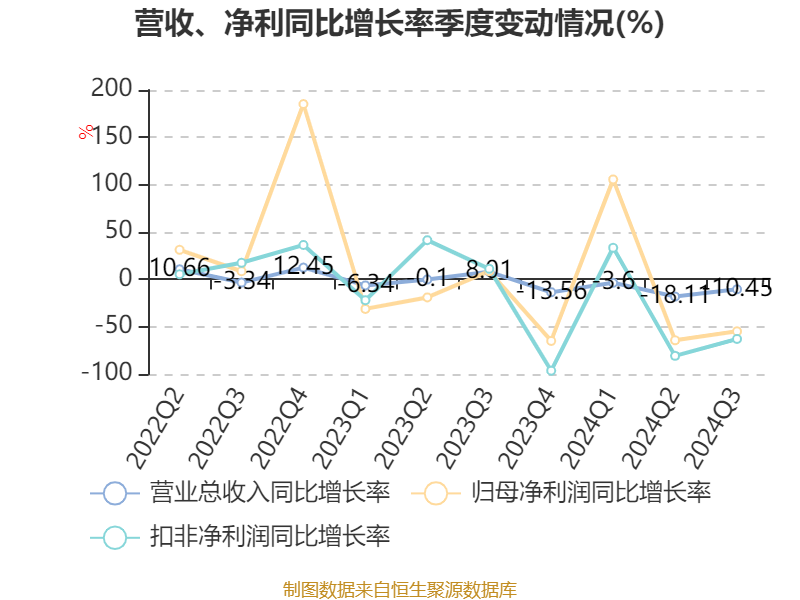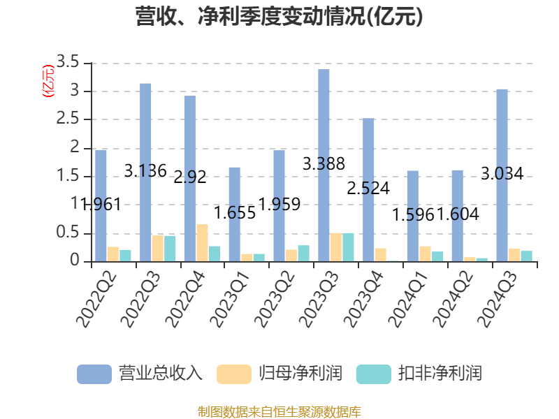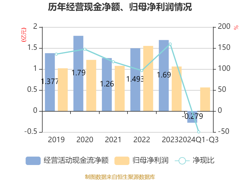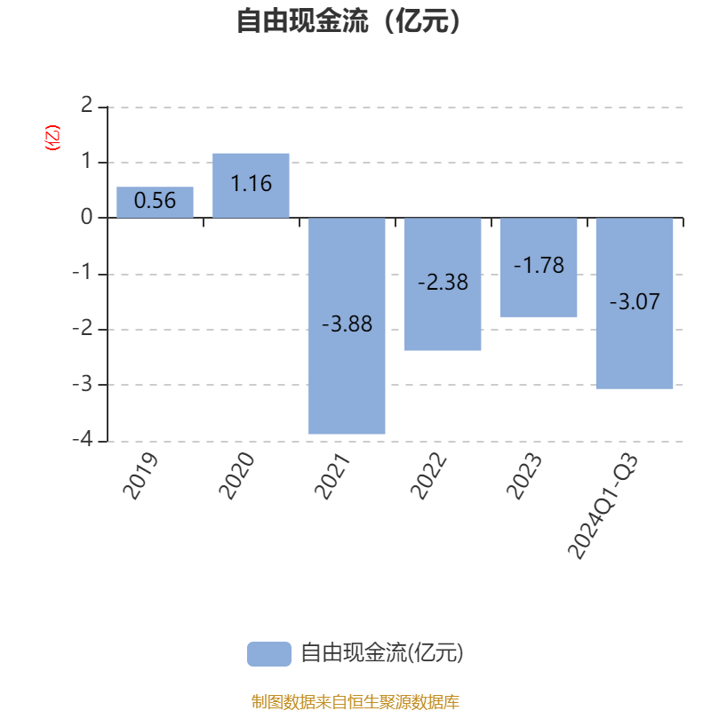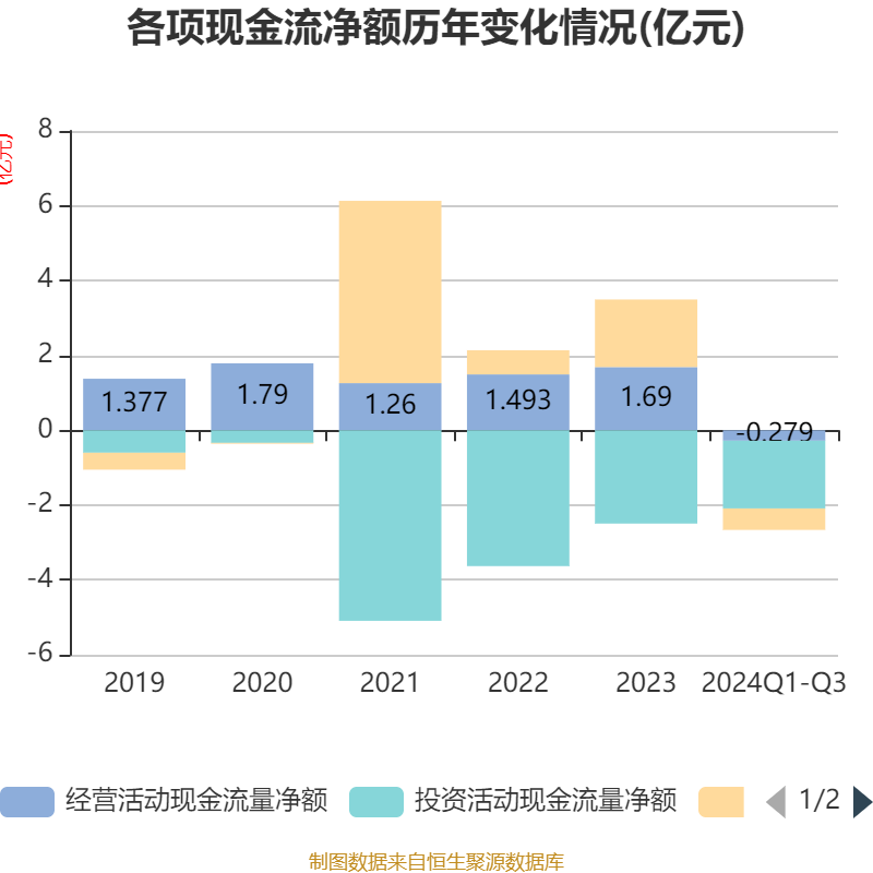 2024年前三季度,公司经营活动现金流净额为-2789.26万元,同比减少5977.54万元;筹资活动现金流净额-5736.62万元,同比减少2.41亿元;投资活动现金流净额-1.81亿元,上年同期为-2.34亿元。