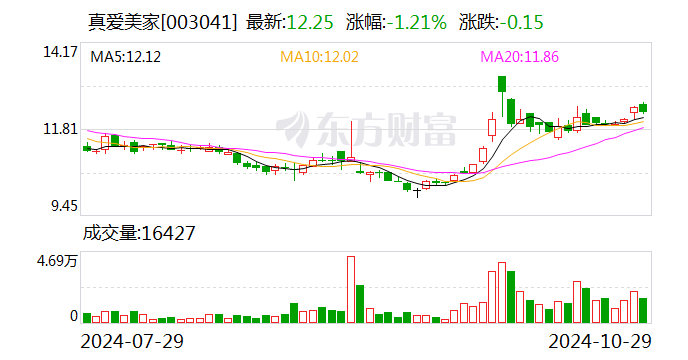 真爱美家(003041)10月30日披露2024年第三季度报告。前三季度公司实现营业收入6.23亿元,同比下降10.97%;归母净利润5613.67万元,同比下降32.40%;扣非净利润4105.26万元,同比下降54.74%;经营活动产生的现金流量净额为-2789.26万元,上年同期为3188.28万元;报告期内,真爱美家基本每股收益为0.3898元,加权平均净资产收益率为4.21%。