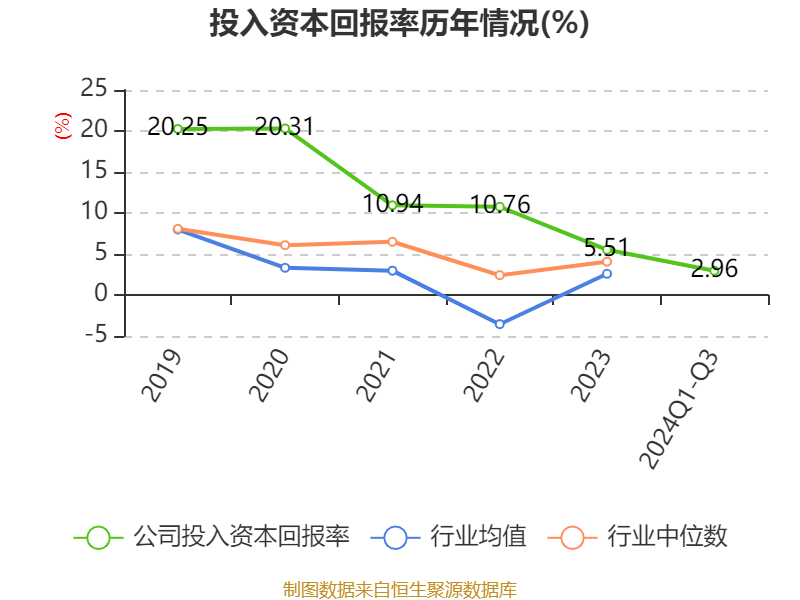 盈利能力方面, 2024年前三季度公司加权平均净资产收益率为4.21%,同比下降2.19个百分点。公司2024年前三季度投入资本回报率为2.96%,较上年同期下降2.01个百分点。