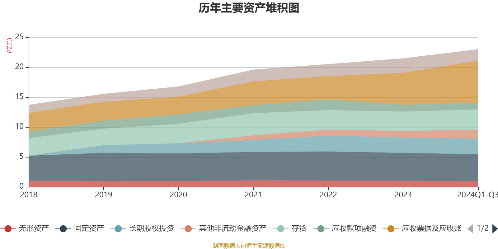 资产重大变化方面,截至2024年三季度末,公司应收票据及应收账款较上年末增加32.51%,占公司总资产比重上升5.81个百分点;货币资金较上年末减少20.78%,占公司总资产比重下降2.76个百分点;固定资产较上年末减少3.12%,占公司总资产比重下降1.87个百分点;其他非流动金融资产较上年末增加40.37%,占公司总资产比重上升1.53个百分点。