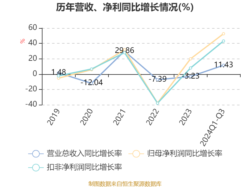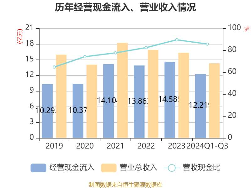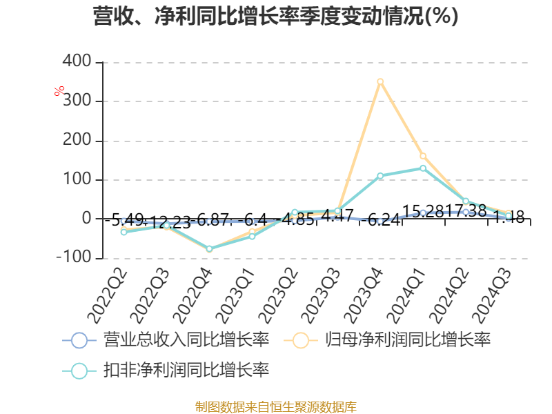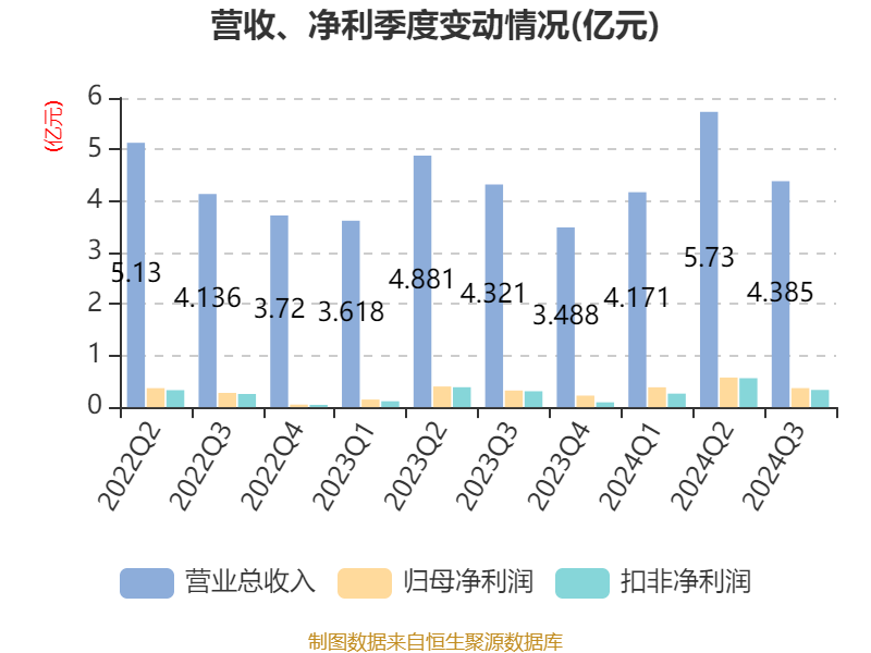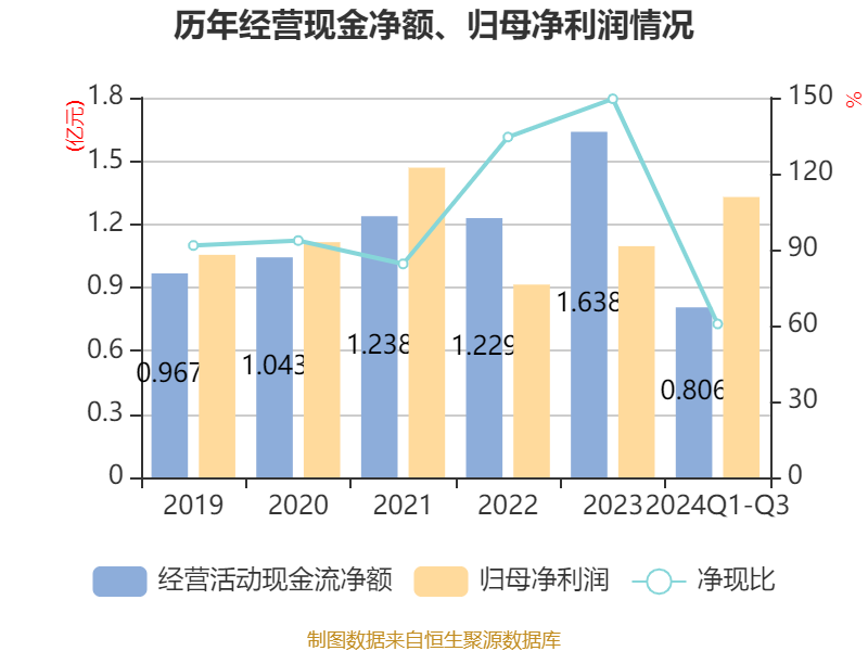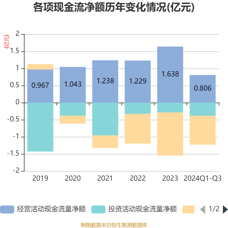 2024年前三季度,公司经营活动现金流净额为8058.49万元,同比增长12.35%;筹资活动现金流净额-8490.72万元,同比减少775.8万元;投资活动现金流净额-3830.39万元,上年同期为-1698.93万元。
