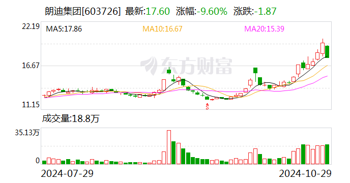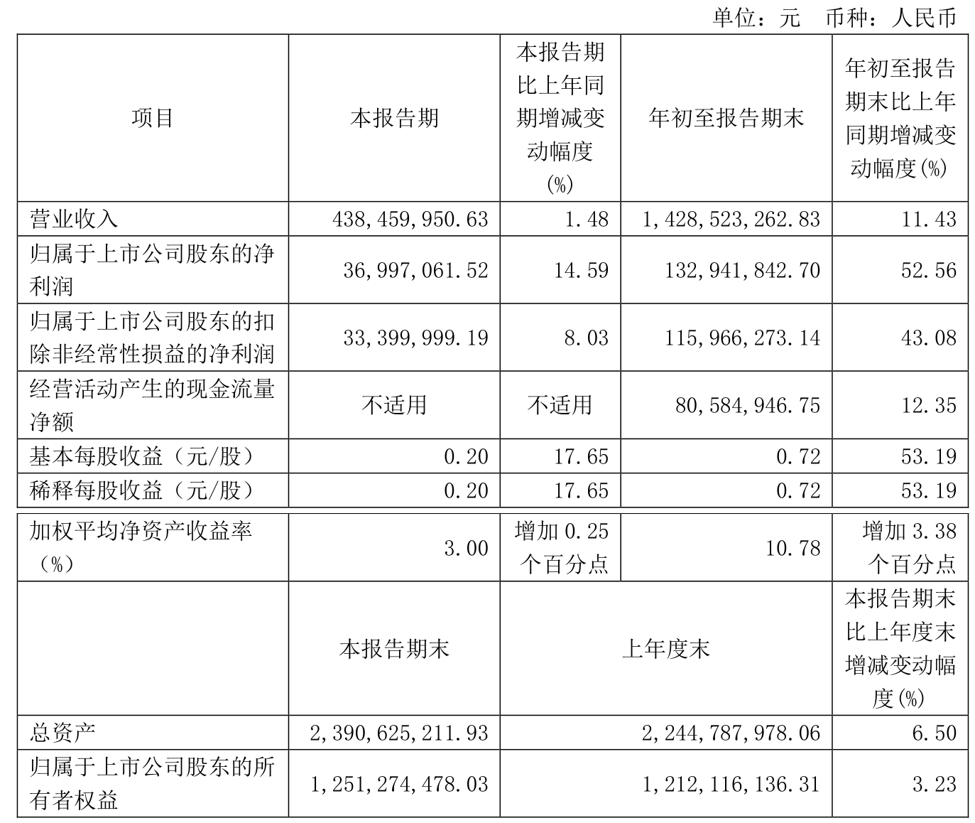 中证智能财讯朗迪集团(603726)10月30日披露2024年第三季度报告。前三季度公司实现营业收入14.29亿元,同比增长11.43%;归母净利润1.33亿元,同比增长52.56%;扣非净利润1.16亿元,同比增长43.08%;经营活动产生的现金流量净额为8058.49万元,同比增长12.35%;报告期内,朗迪集团基本每股收益为0.72元,加权平均净资产收益率为10.78%。