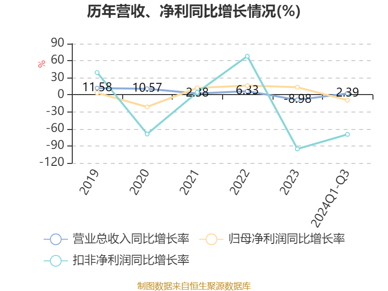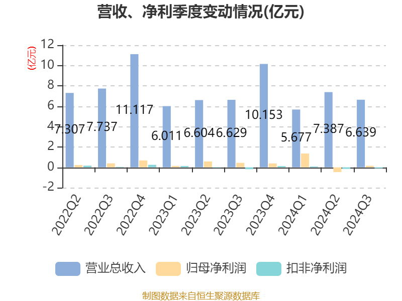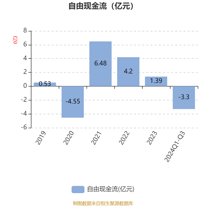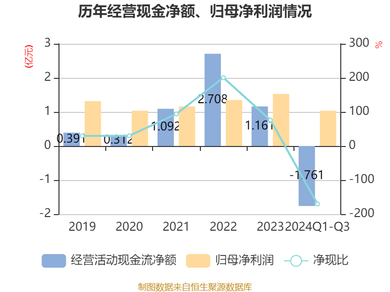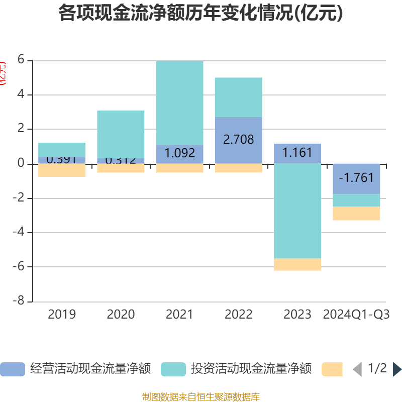 2024年前三季度,公司经营活动现金流净额为-1.76亿元,同比减少1.95亿元;筹资活动现金流净额-7878.7万元,同比减少907.11万元;投资活动现金流净额-7345.61万元,上年同期为8545.6万元。