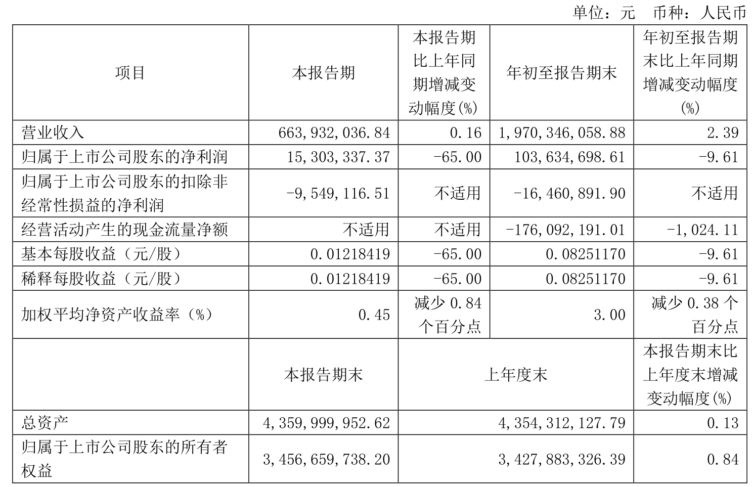 中证智能财讯东方通信(600776)10月30日披露2024年第三季度报告。前三季度公司实现营业收入19.7亿元,同比增长2.39%;归母净利润1.04亿元,同比下降9.61%;扣非净利润亏损1646.09万元,上年同期亏损969.83万元;经营活动产生的现金流量净额为-1.76亿元,上年同期为1905.53万元;报告期内,东方通信基本每股收益为0.0825元,加权平均净资产收益率为3.00%。