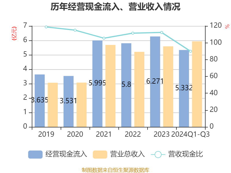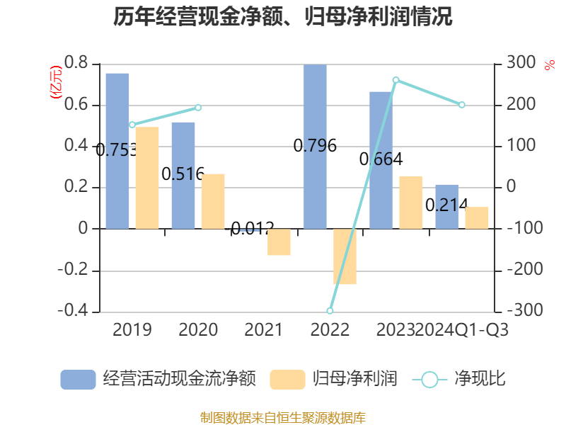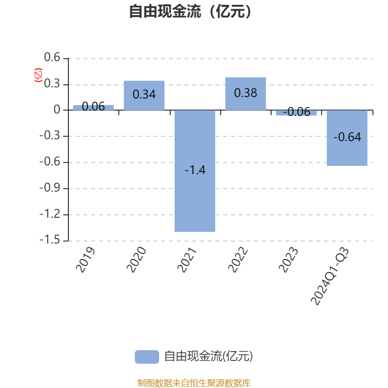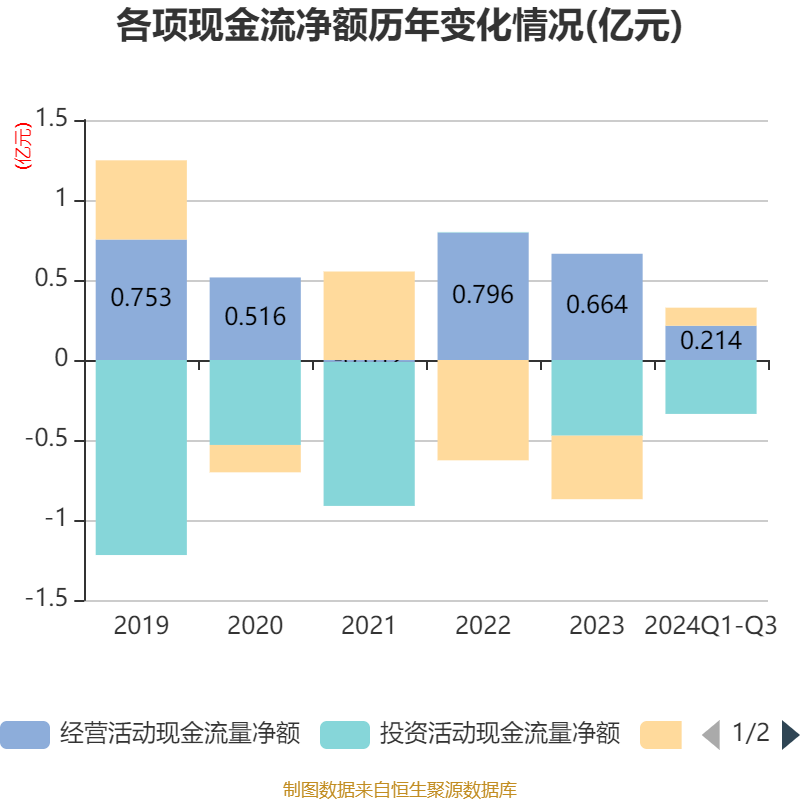 2024年前三季度,公司经营活动现金流净额为2141.49万元,同比下降66.23%;筹资活动现金流净额1132.65万元,同比增加6457.29万元;投资活动现金流净额-3366.83万元,上年同期为-3027.87万元。