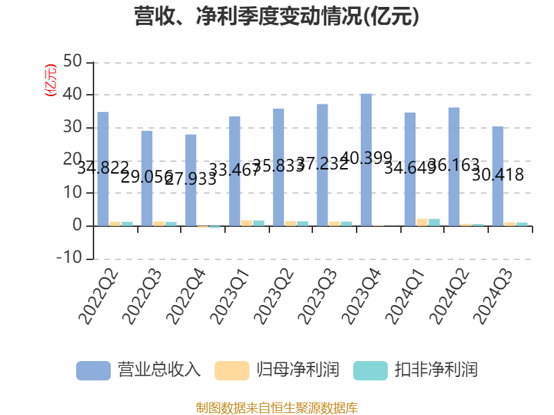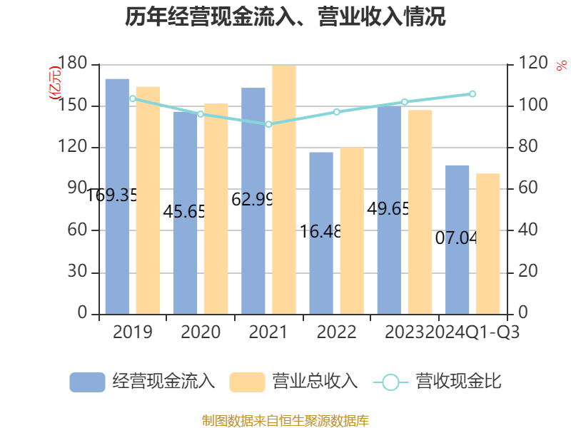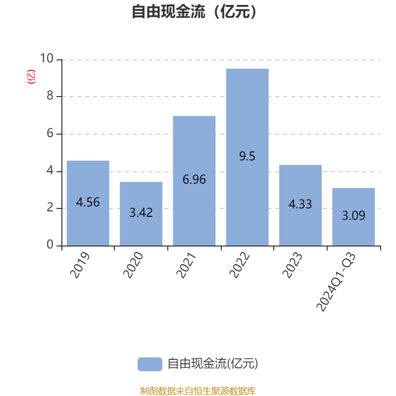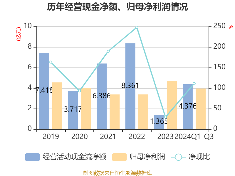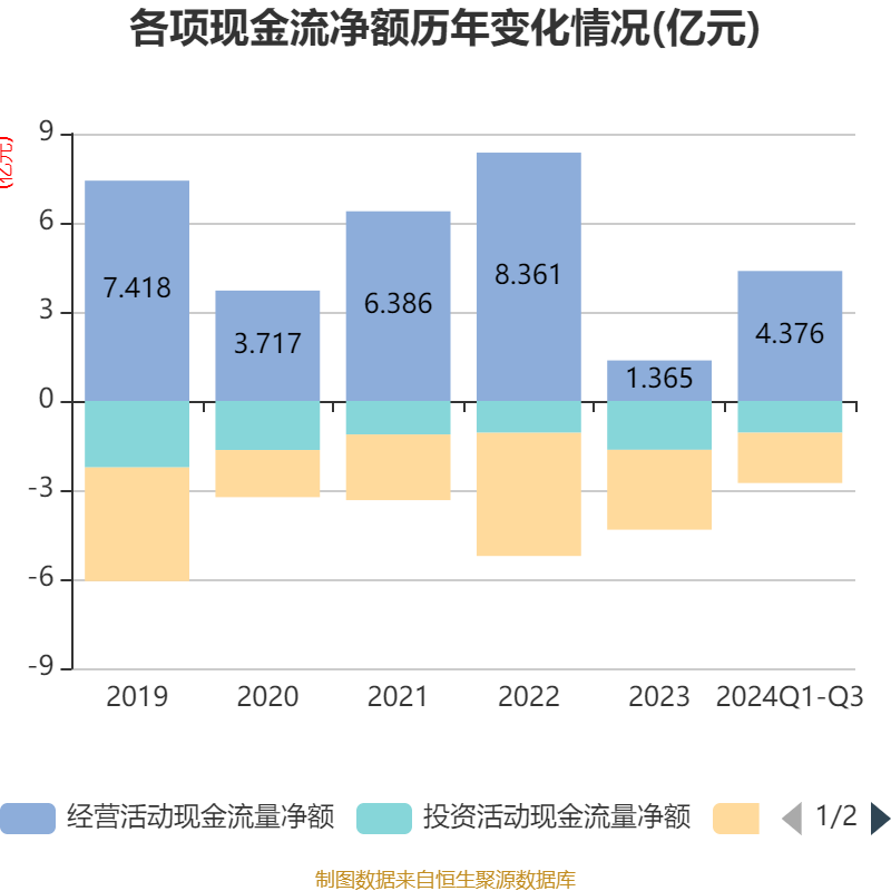2024年前三季度,公司经营活动现金流净额为4.38亿元,同比增长268.33%;筹资活动现金流净额-1.69亿元,同比增加9507.79万元;投资活动现金流净额-1.07亿元,上年同期为-1.16亿元。