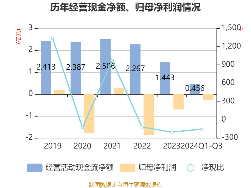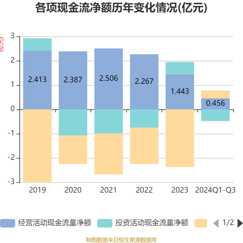 2024年前三季度,公司经营活动现金流净额为4561.79万元,同比下降48.85%;筹资活动现金流净额3201.82万元,同比增加2.18亿元;投资活动现金流净额-4805.91万元,上年同期为6694.01万元。