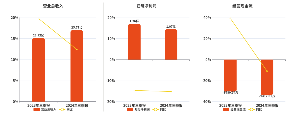 公司营业总收入为25.77亿元,在已披露的同业公司中排名第3,较去年同报告期营业总收入增加2.85亿元,实现5年连续上涨,同比较去年同期上涨12.41%。归母净利润为1.07亿元,在已披露的同业公司中排名第3,较去年同报告期归母净利润减少1918.57万元,同比较去年同期下降15.20%。经营活动现金净流入为-9417.01万元,在已披露的同业公司中排名第8,较去年同报告期经营活动现金净流入减少936.06万元。