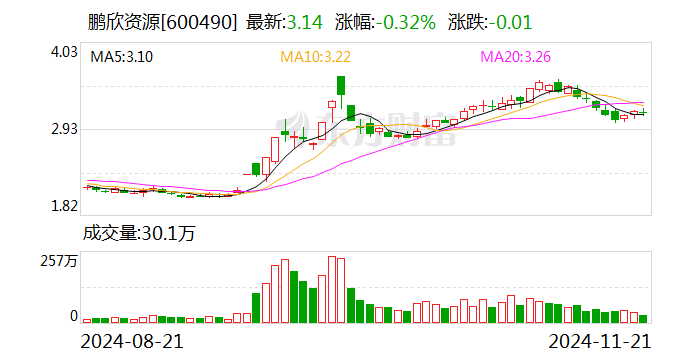 二级市场上,截至21日收盘,鹏欣资源跌0.32%,报3.14元/股,总市值69.48亿元;国中水务涨1.65%,报4.32元/股,总市值69.72亿元。
