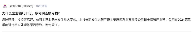 每年营收几十亿元,但为什么净利润却连续4年亏损?近日,有投资者在互动平台向启迪环境提问。对此,启迪环境12月2日回复表示:公司主营业务未发生重大变化。本报告期发生大额亏损主要原因系重要参股公司被申请破产重整,公司在2024第三季度进行相应处理等原因导致。