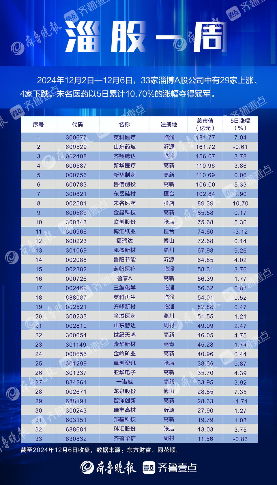 在此背景下,本周33家淄博A股上市公司中有29家上涨、4家下跌。未名医药(维权)以5日累计10.70%的涨幅夺得冠军,卓创资讯以5日涨幅9.87%排名第二,凯盛新材以5日涨幅9.26%位列第三。