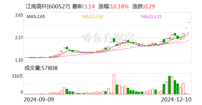 江南高纤盘中涨停,已连收3个涨停板,截至9:27,该股报3.14元,换手率0.14%,成交量238.14万股,成交金额747.77万元,涨停板封单金额为10.77亿元。连续涨停期间,该股累计上涨33.62%,累计换手率为10.74%。最新A股总市值达54.38亿元。
