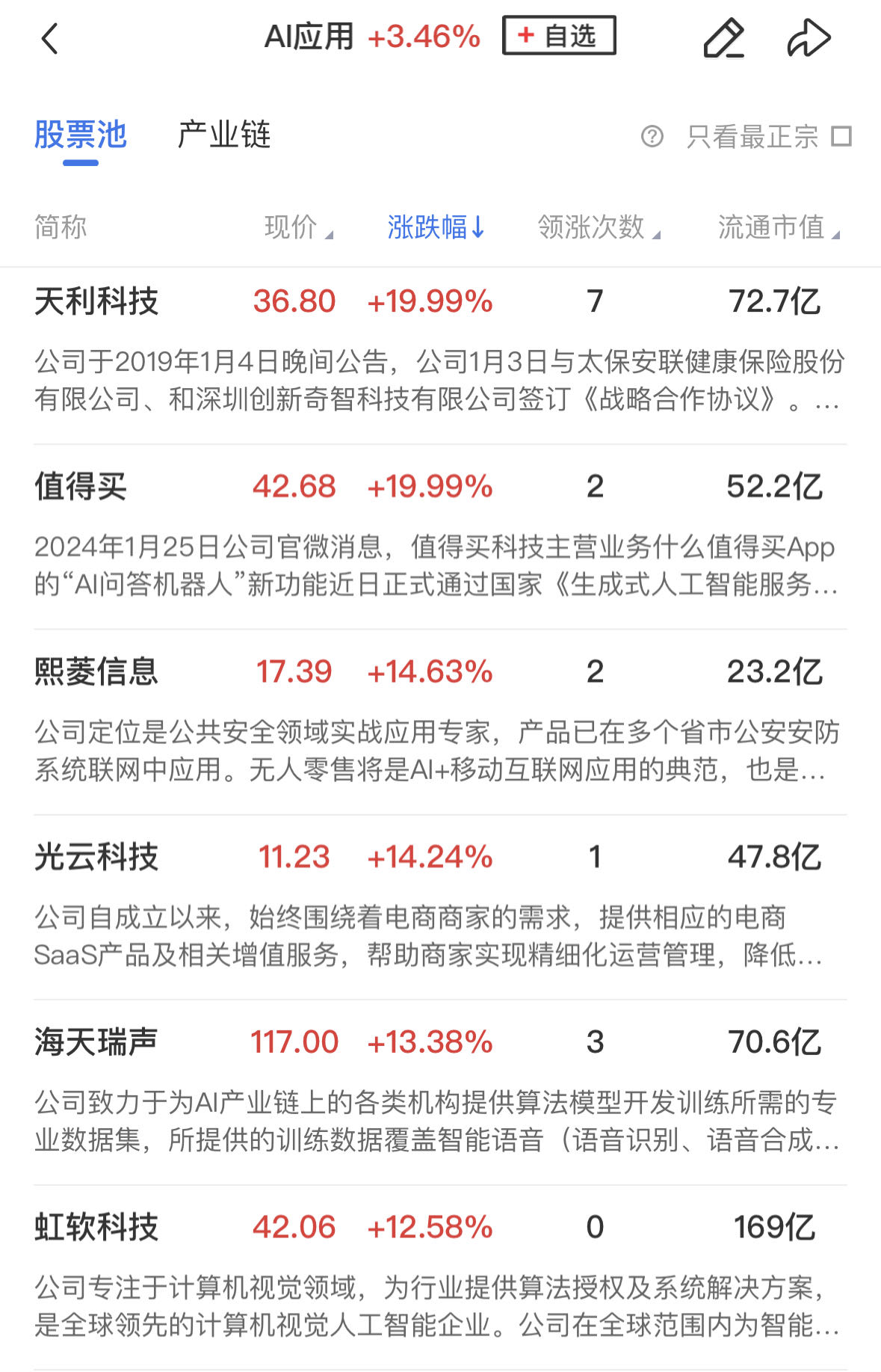 AI应用方向再度活跃,天娱数科、金财互联、华扬联众、值得买、汉王科技、新华传媒等个股涨停,福石控股、海天瑞声、当虹科技、风语筑、易点天下等个股涨幅居前。