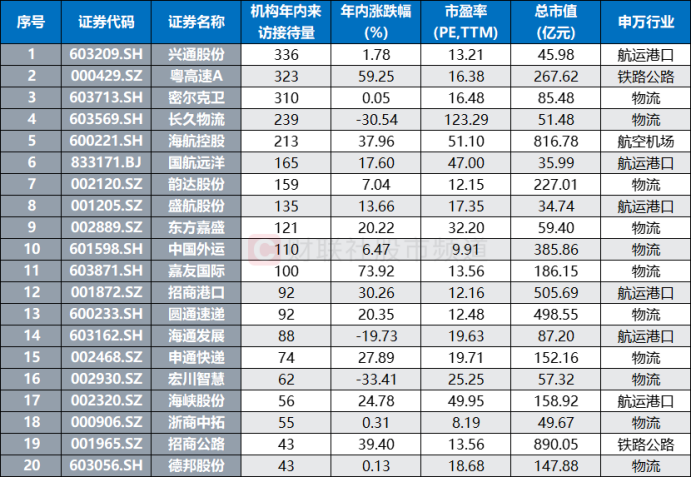 注:年内机构调研居前的交通运输概念股(截至12月16日收盘)