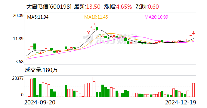 大唐电信盘中涨停,已连收3个涨停板,截至9:30,该股报14.19元,换手率7.70%,成交量6779.13万股,成交金额9.19亿元,连续涨停期间,该股累计上涨33.11%,累计换手率为18.92%。最新A股总市值达184.98亿元,A股流通市值124.94亿元。