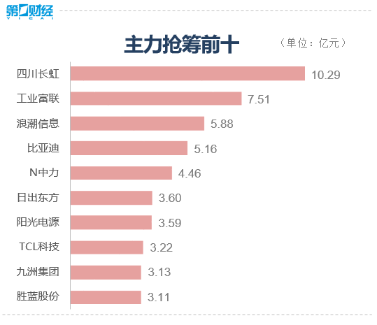 具体到个股来看,四川长虹、比亚迪、华林证券获净流入18.87亿元、10.66亿元、10.08亿元。