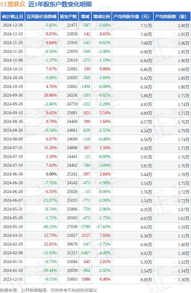 从股价来看,2024年12月10日至2024年12月20日,ST易联众区间跌幅为3.85%,在此期间股东户数减少587.0户,减幅为2.66%。