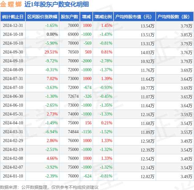 从股价来看,2024年10月31日至2024年12月31日,金螳螂区间跌幅为1.65%,在此期间股东户数增加1000.0户,增幅为1.45%。
