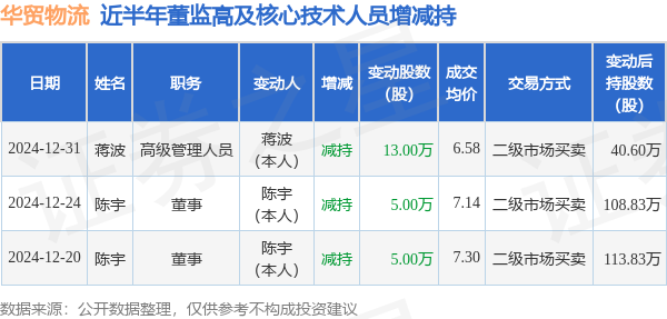 华贸物流近半年内的董监高及核心技术人员增减持详情如下: