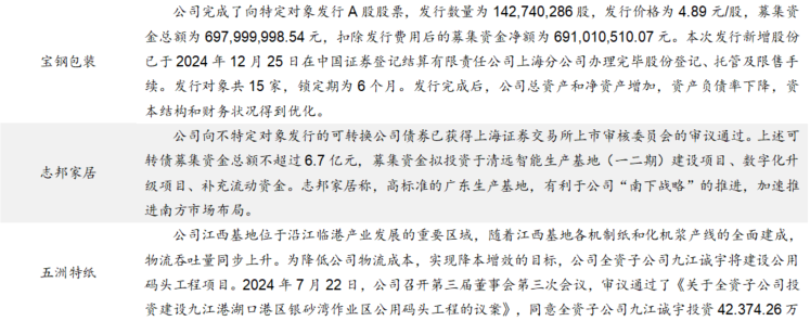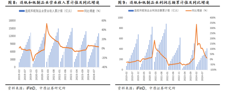 造纸:规模以上造纸企业收入、利润持续增长但增速放缓,产量增长但增速下降;废黄板纸价格继续上涨,针叶浆高位运行,阔叶浆先跌后涨,下旬快速拉涨扭转下跌势头;包装纸规模纸厂多次涨价,中小纸厂跟涨,终端消费回暖,价格持续上涨;文化纸刚需订单提货,部分产线停机检修,价格上涨;国家发布2025年加力扩围实施大规模设备更新和消费品以旧换新政策的通知,提出对手机、平板、智能手表手环等3类数码产品进行购新补贴,包装用纸需求有望得到提振。