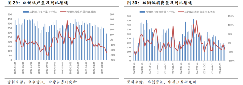 2024年11月,双铜纸月度产量为29.24万吨,同比下降25.41%;2024年11月,双铜纸月度消费量为17.75万吨,同比下降35.01%。