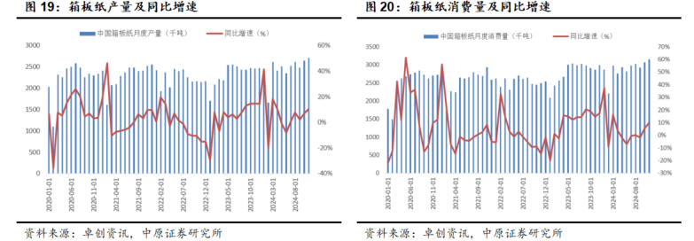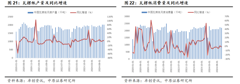 2024年11月,瓦楞纸月度产量为202.52万吨,同比增长5.30%;2024年11月,瓦楞纸月度消费量为220.16万吨,同比下降1.75%。