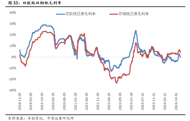 从盈利能力来看,毛利率水平于2024年12月呈现先升后降走势,12月末毛利率较上月末变化不大。2024年12月31日,双胶纸、双铜纸日度毛利率分别为0.03%、4.54%,较上月末分别+1.25pct、-0.04pct。