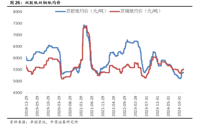 从价格来看,双胶纸、双铜纸价格2024年12月上涨,偏强运行,根据卓创资讯,双胶纸纸厂挺价意愿较强,下游出版类订单有提货动作,原纸库存减少,支撑价格上行,且月内大型产线继续停机,供应端偏紧;双铜纸部分纸厂积极敦促涨价函落实,部分刚需类订单月内进行提货,加之个别厂家产线月内处于停机状态,供需边际有所改善。2024年12月31日,双胶纸、双铜纸价格分别为5388、5530元/吨,分别较上月末上涨3.61%、2.03%。