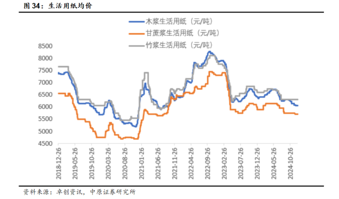 从价格来看,各类生活用纸价格均较为稳定。2024年12月31日,木浆、甘蔗浆、竹浆生活用纸价格分别为6067、5700、6300元/吨,分别较上月末-0.55%、-0.87%、+0%。