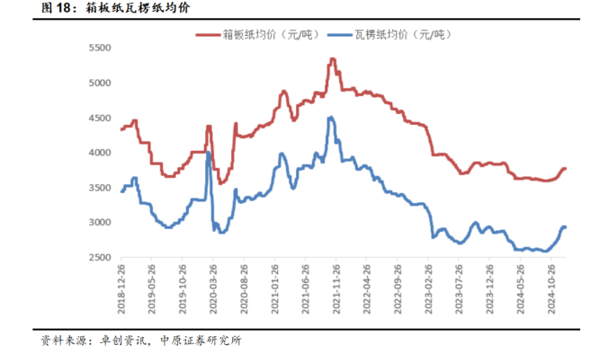 从盈利能力来看,2024年12月末毛利率较上月末有所上升,瓦楞纸上升更为明显,虽然原料废黄板纸价格调涨,但纸价涨幅大于综合成本上涨幅度,因此毛利率呈上升走势。2024年12月31日,箱板纸、瓦楞纸毛利率分别为17.86%、12.22%,较上月末分别+1.41pct、+4.76pct。